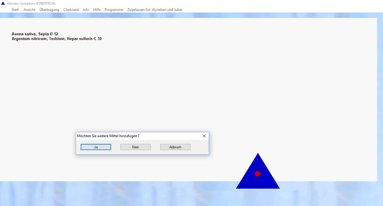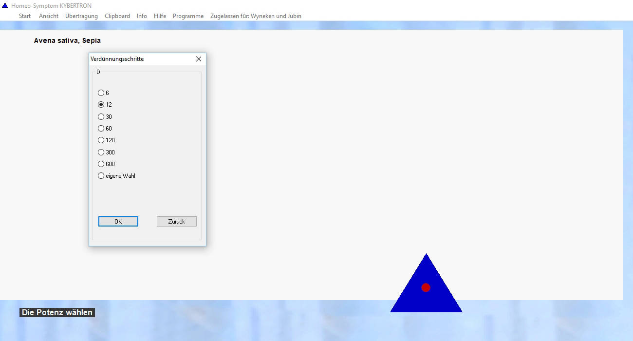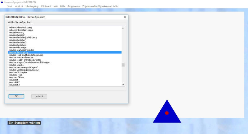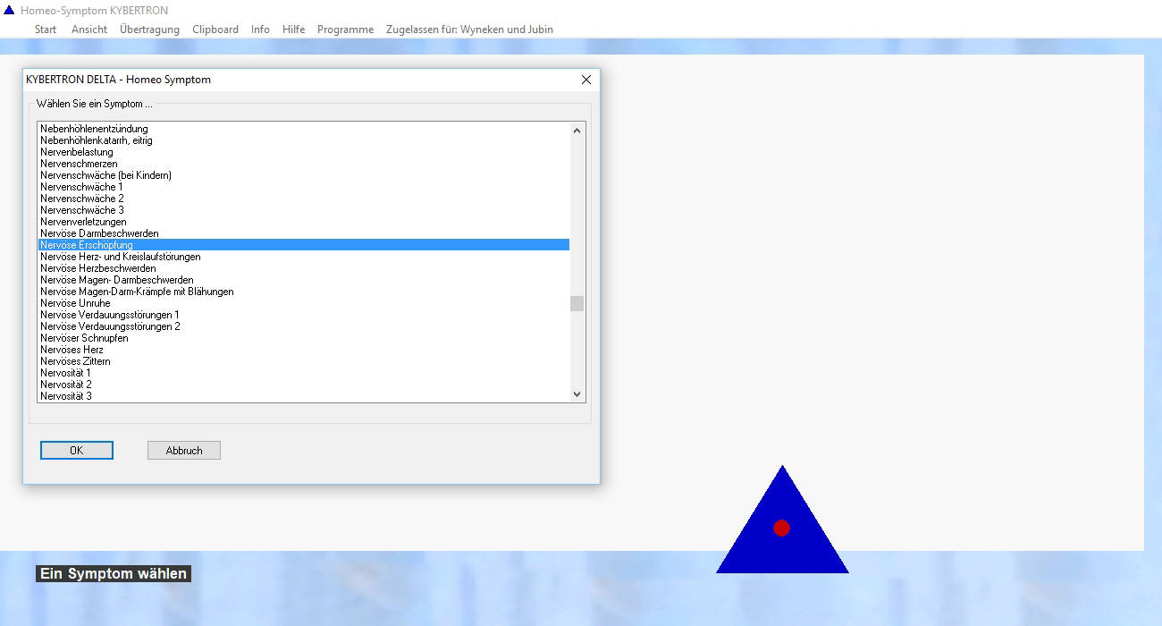 Wählen Sie aus über 900 Symptomen und Zuständen und übertragen Sie die Schwingungen auf Wassertröpfchen, andere Trägersubstanzen oder andere Objekte. Wenn Sie z.B. vom Symptom "Nervöse Erschöpfung" ausgehen, erscheint eine Zusammenstellung verschiedener homöopathischer Mittel.