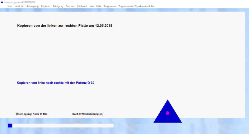 Durch die Übertragung erhalten Sie eine bioenergetische Kopie, die Sie auf der rechten Platte in Wasser oder eine andere Trägersubstanz einschwingen können.